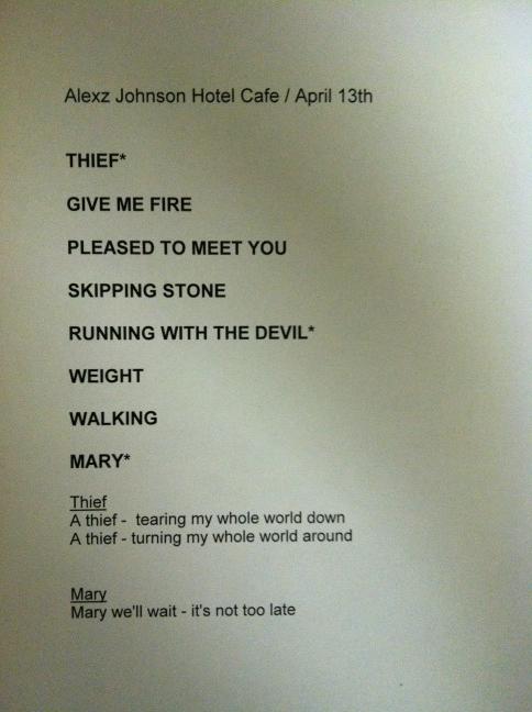 Some more information about Alexz’s show at the Hotel Cafe last night has come including her setlist. Which has a very nice surprise.