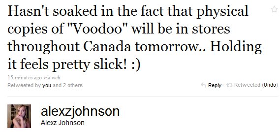 I’m not a resident of Canada, but I’d be out in stores looking for Voodoo, probably buying it again 😀 tomorrow. Imagine holding your own album in your hands! Less than 24 hours…
